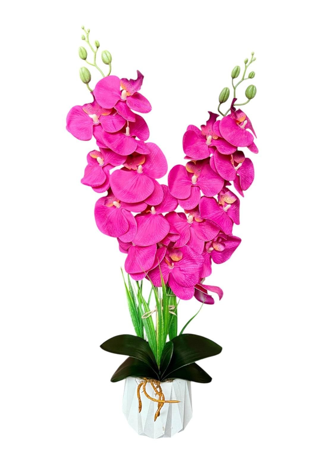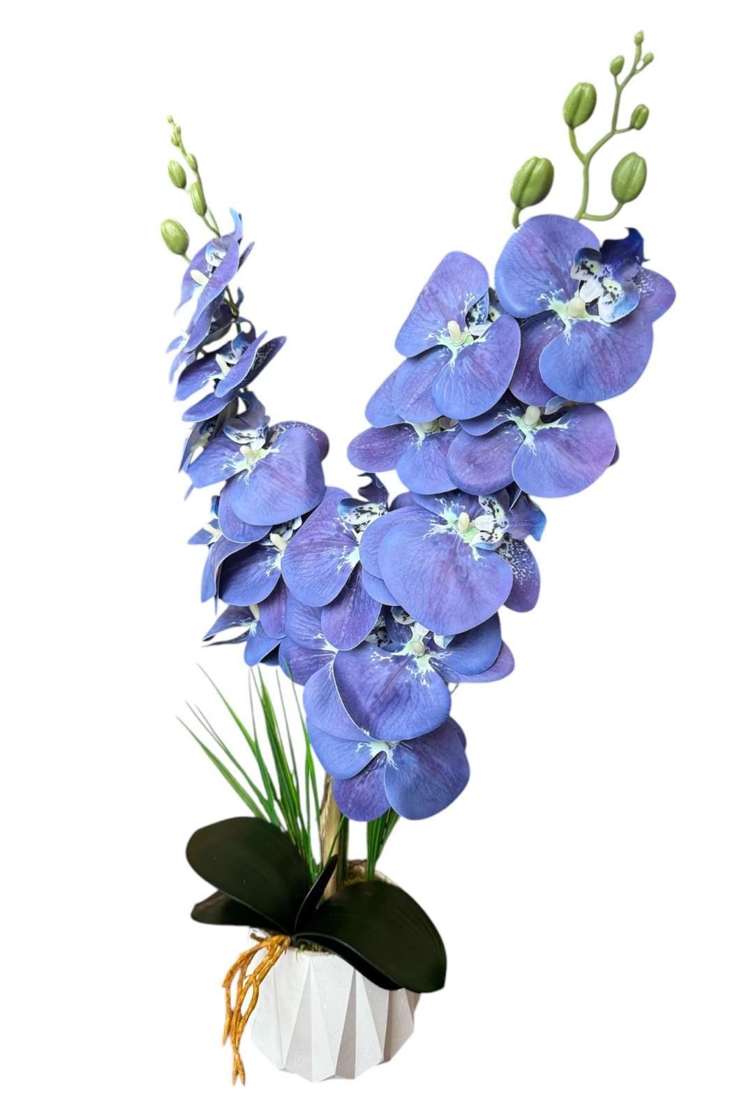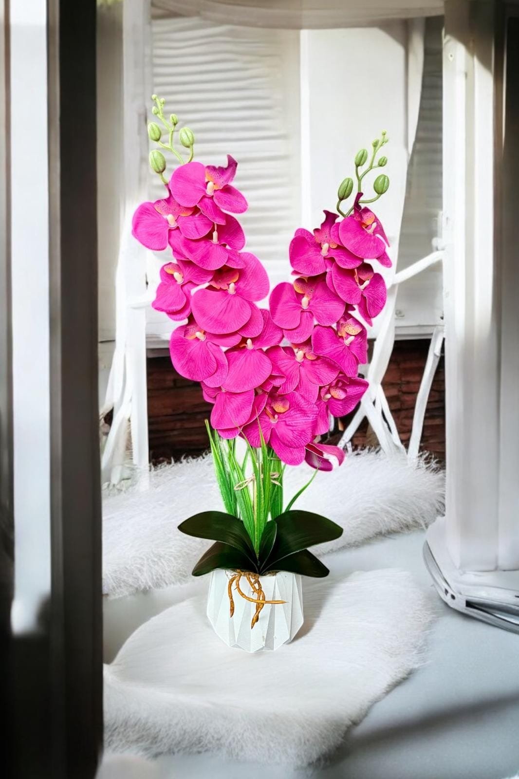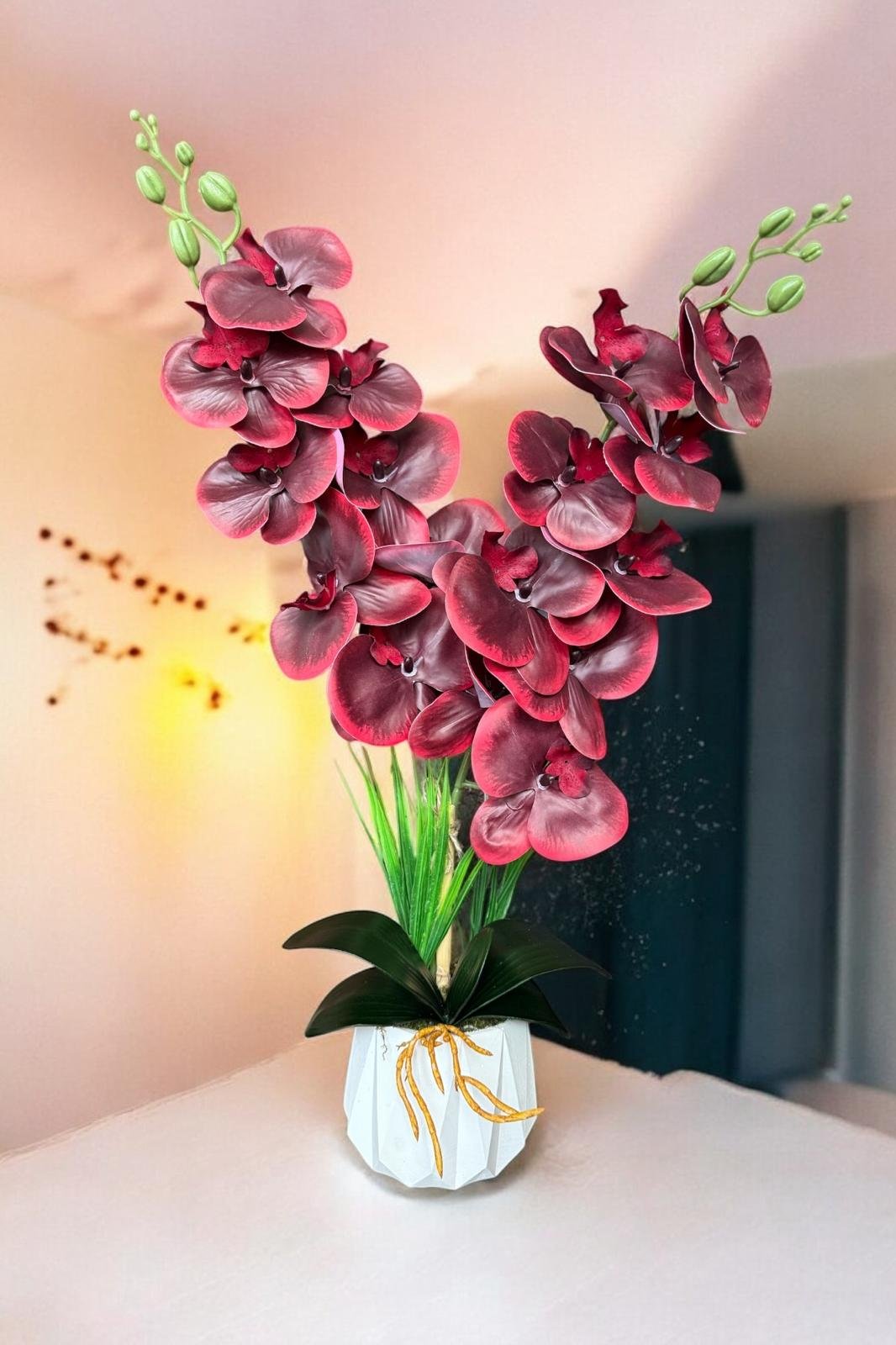 Evinizin veya ofisinizin atmosferine sofistike bir dokunuş katmak için tasarlanan bu yapay orkide ağacı, doğal güzelliği ve zarafetiyle göz kamaştırıyor. 60 cm boyutu ve beyaz beton saksısıyla her mekana kolayca uyum sağlayan bu özel tasarım, iki adet yüksek kaliteli, ıslak görünümlü orkide dalıyla gerçeğinden ayırt edilmesi zor bir estetik sunuyor.