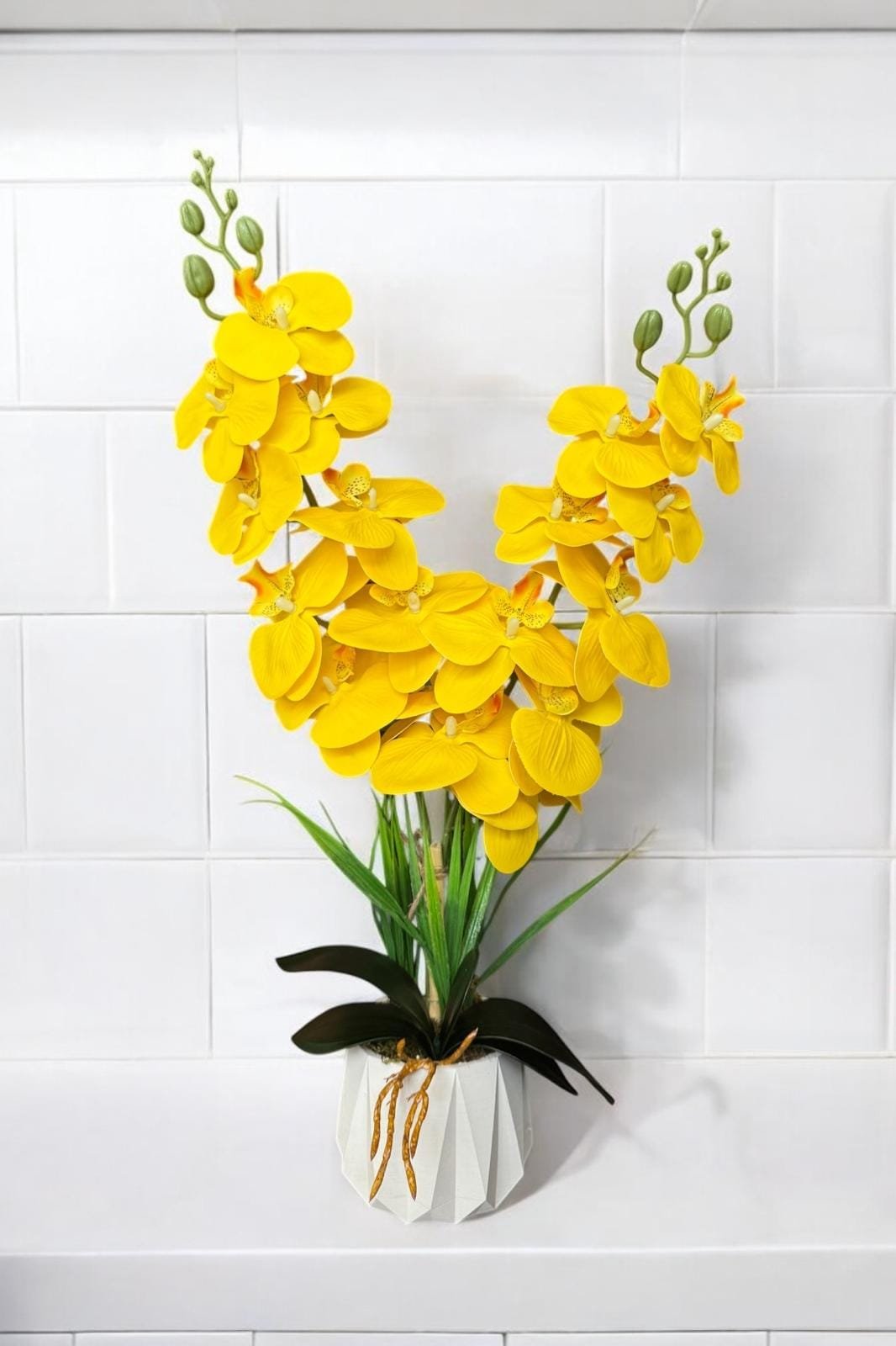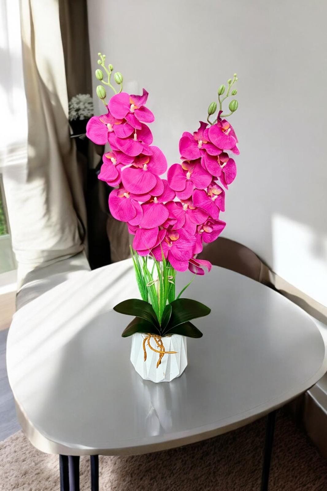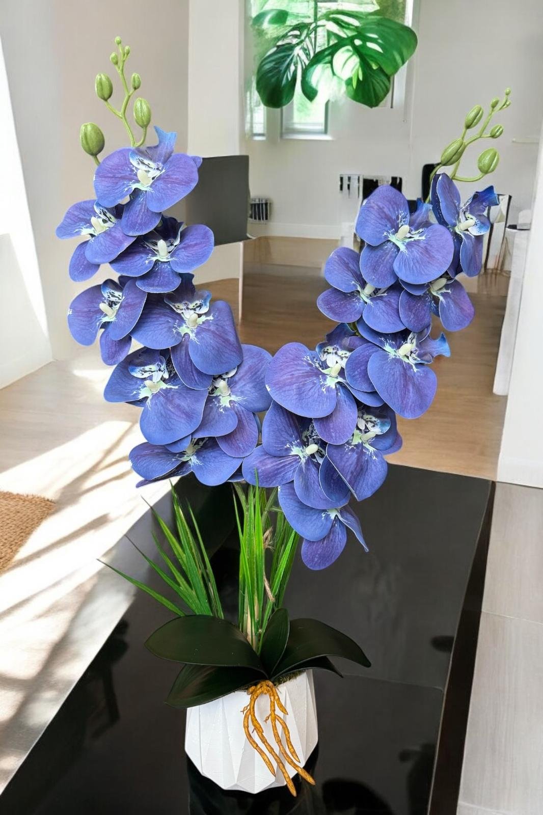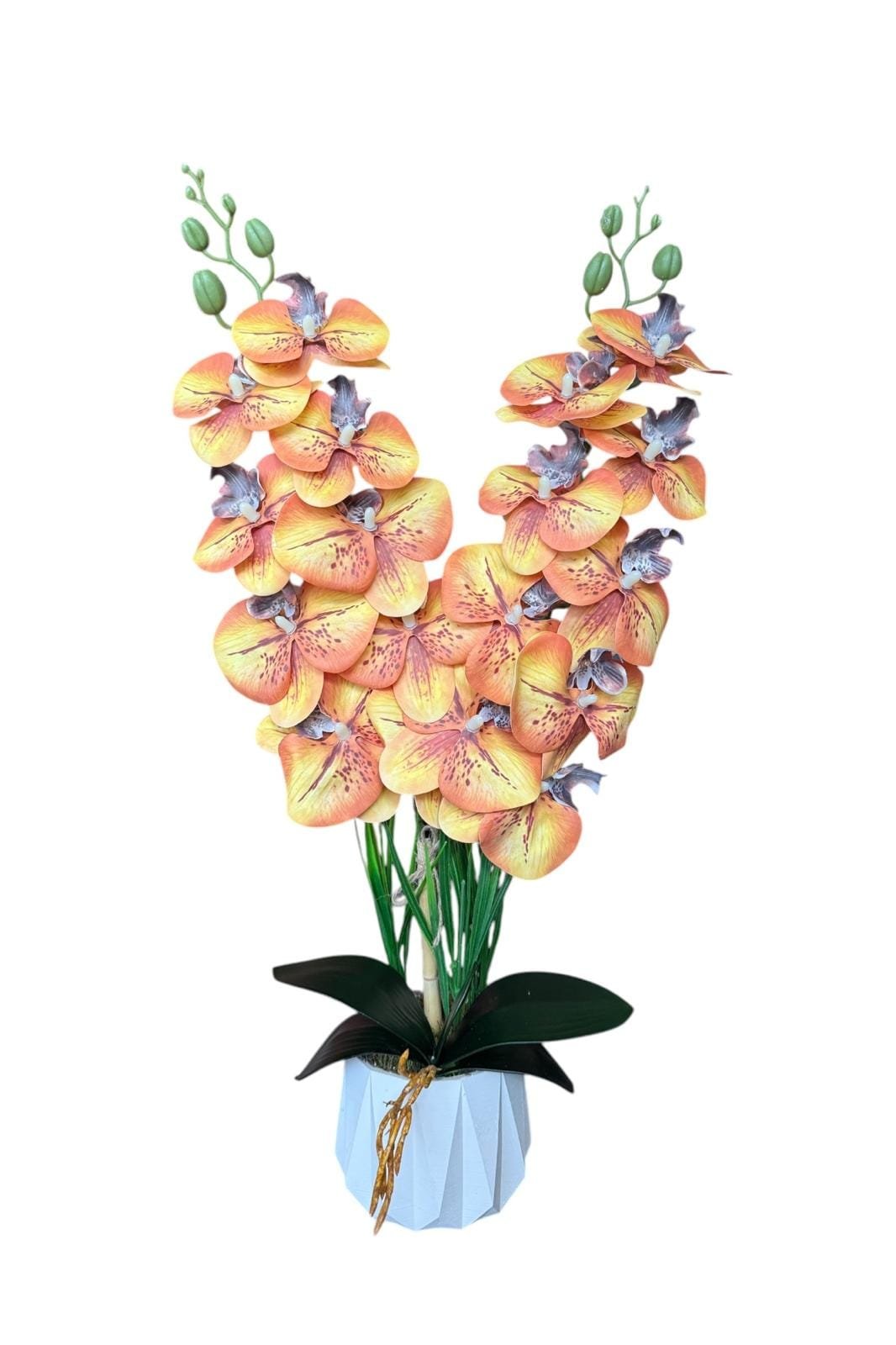 Evinizin veya ofisinizin atmosferine sofistike bir dokunuş katmak için tasarlanan bu yapay orkide ağacı, doğal güzelliği ve zarafetiyle göz kamaştırıyor. 60 cm boyutu ve beyaz beton saksısıyla her mekana kolayca uyum sağlayan bu özel tasarım, iki adet yüksek kaliteli, ıslak görünümlü orkide dalıyla gerçeğinden ayırt edilmesi zor bir estetik sunuyor.