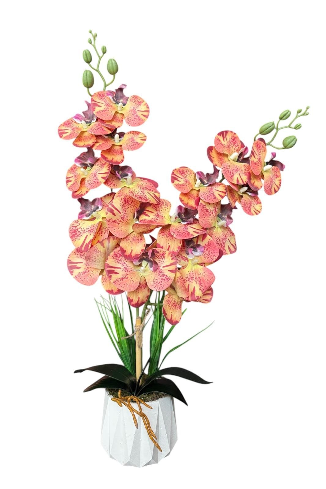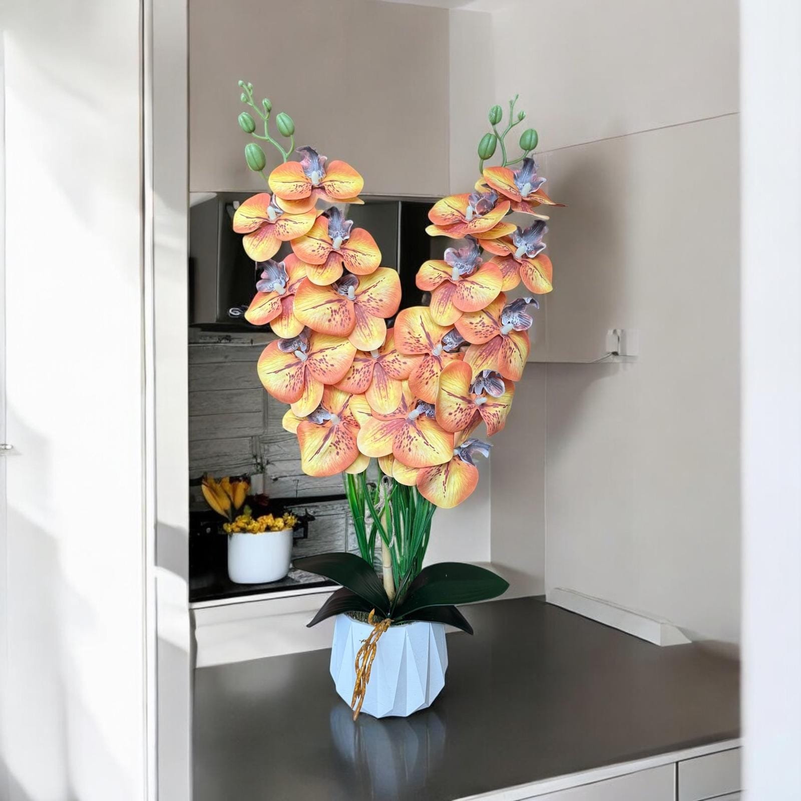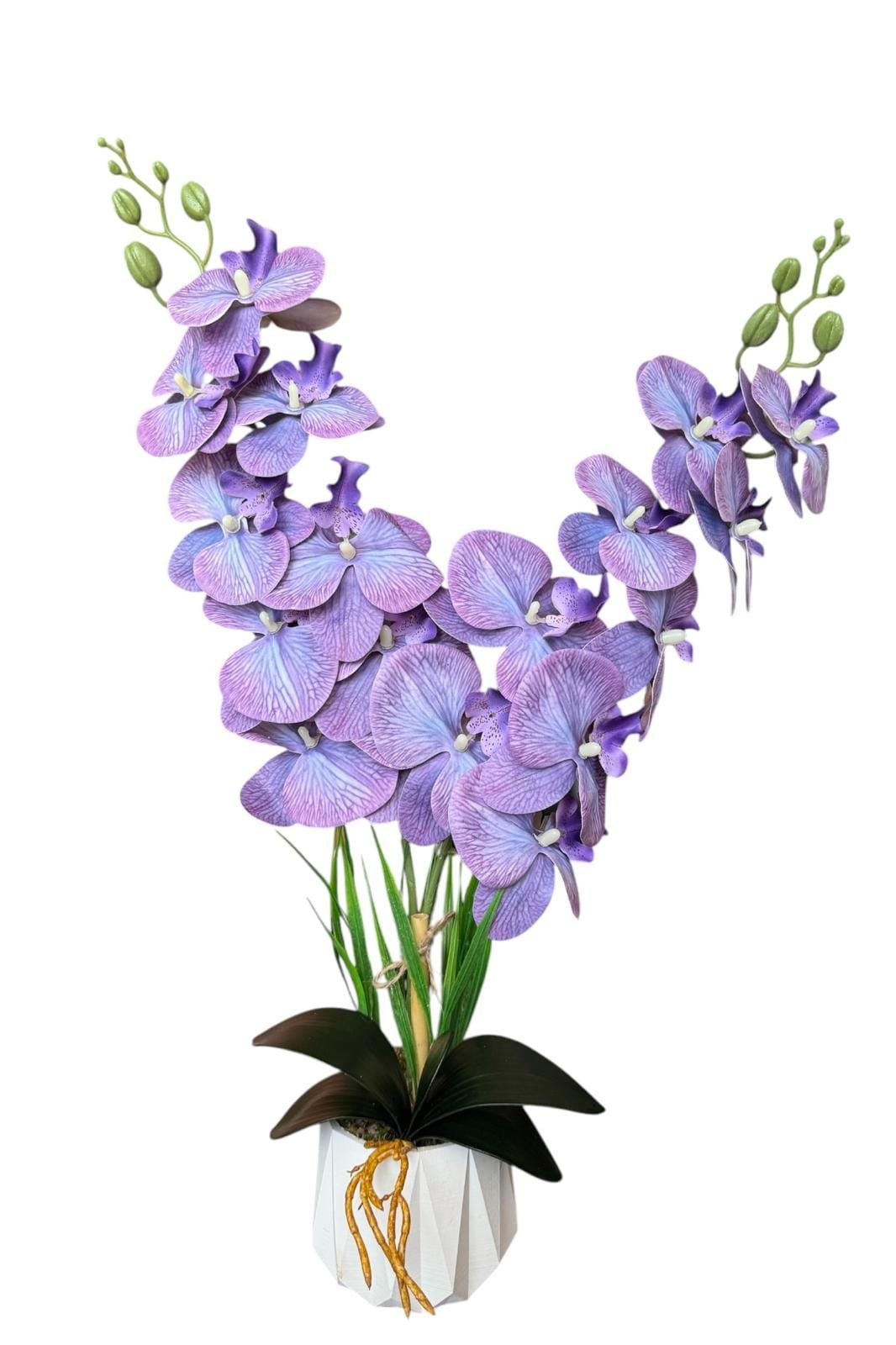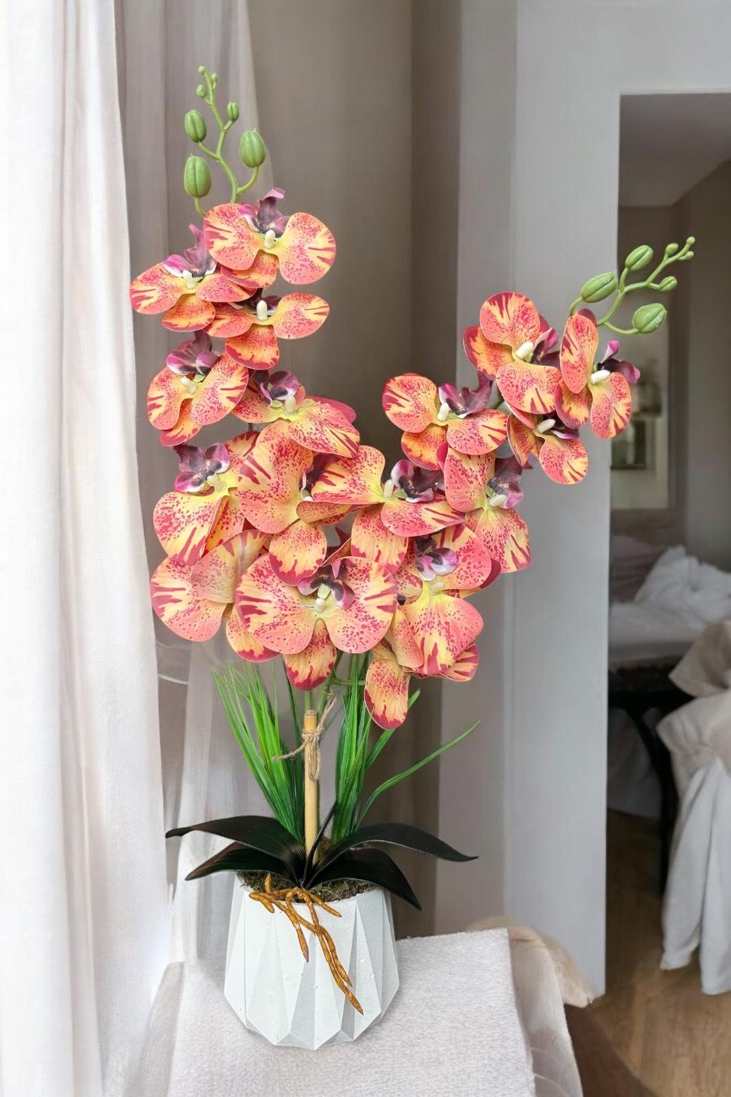 Evinizin veya ofisinizin atmosferine sofistike bir dokunuş katmak için tasarlanan bu yapay orkide ağacı, doğal güzelliği ve zarafetiyle göz kamaştırıyor. 60 cm boyutu ve beyaz beton saksısıyla her mekana kolayca uyum sağlayan bu özel tasarım, iki adet yüksek kaliteli, ıslak görünümlü orkide dalıyla gerçeğinden ayırt edilmesi zor bir estetik sunuyor.