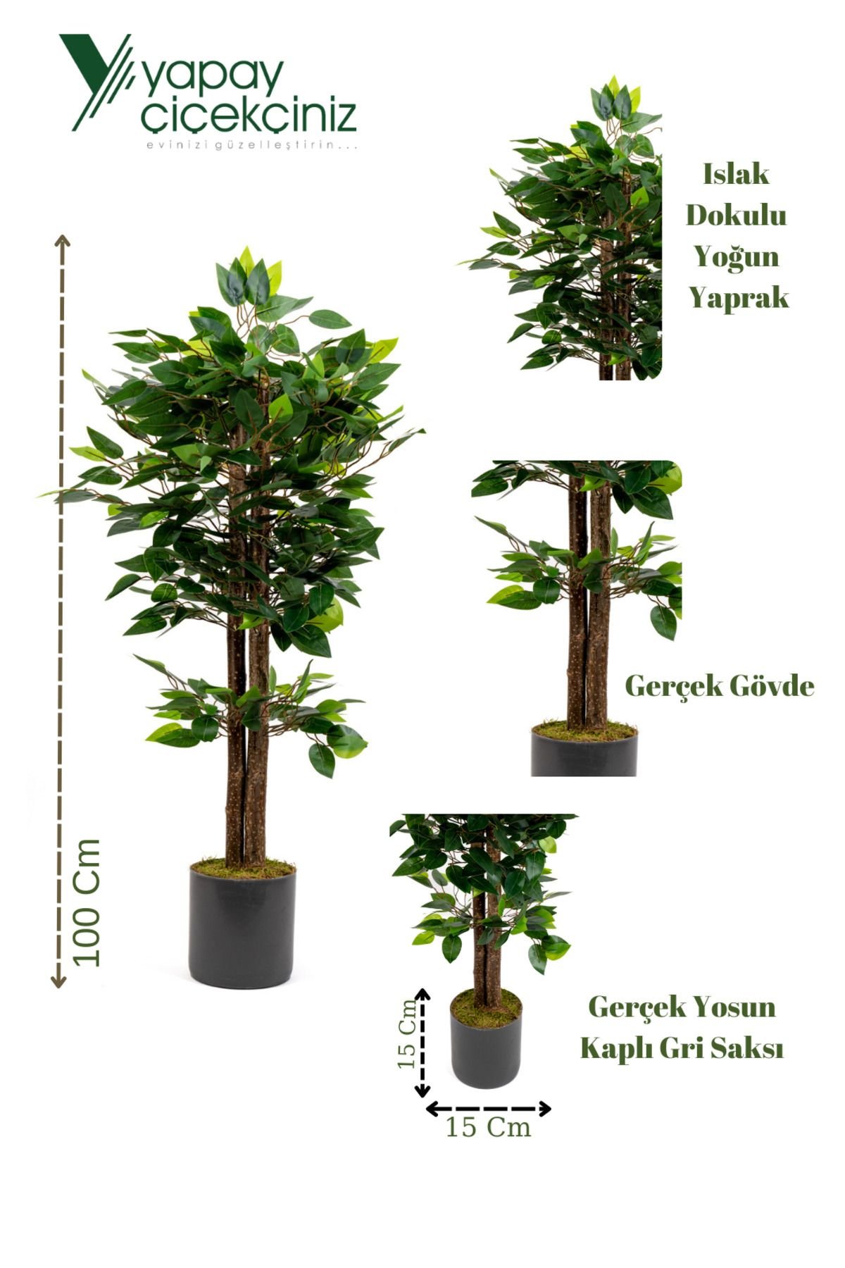 Yapay benjamin ağacımız, doğal ağaç gövdesi üzerine ıslak görünümlü yoğun yapraklar kullanılarak gerçeğe en yakın şekilde tasarlanmıştır. Gerçek benjamin ağacının aksine ağacımız sonsuza dek canlı ve yeşil rengini korumaktadır. ; Her hangi bir bakım gerektirmez. ; Ağaç kutudan çıkarıldığında tam boyutuna ulaşması için sadece 2-3 dakikaya ihtiyacınız vardır. Tüm dallar, gerektiğinde farklı konumlara ayarlanabilmeleri için sağlam metal tellerle donatılmıştır, ayrıca mini ışıkları ve diğer küçük nesneleri destekleyecek kadar güçlüdürler. ; Ağaç plastik saksı içerisine beton ile sabitlenmiş olup, çocuklarınız ve evcil hayvanlarınız temas ettiğinde hemen devrilme yapmaz. ; Saksı rengi:Gri ; Saksı yüksekliği:15 cm ; Saksı çapı:15 cm ;