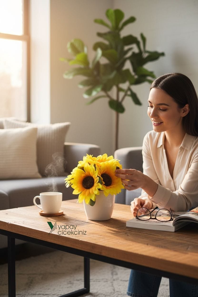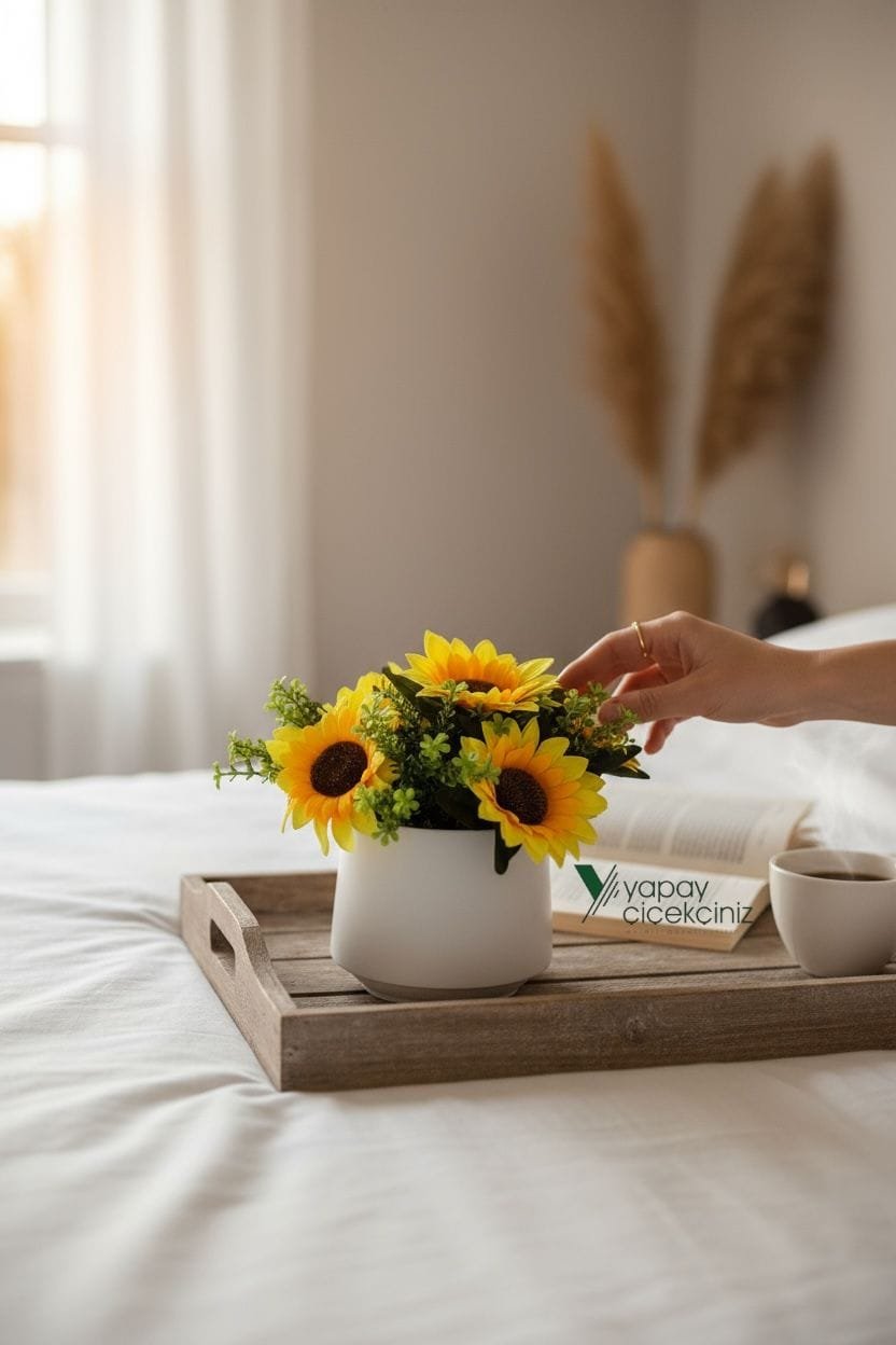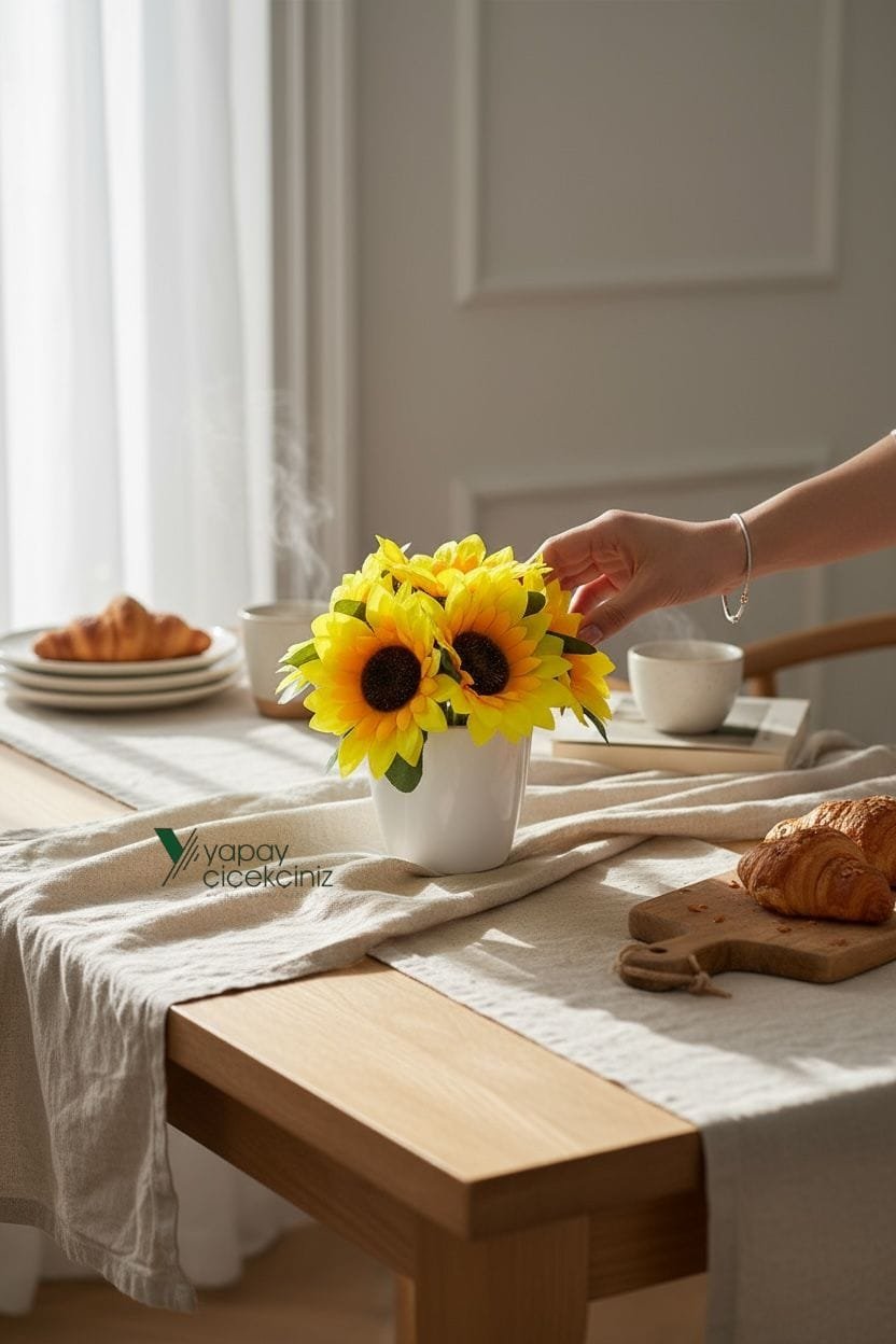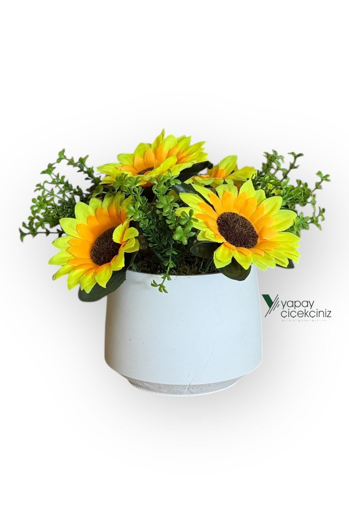 Güneşin enerjisini yılın her günü eve taşımak için tasarlandı. Modern beyaz saksısı ile minimal dekorlara uyum sağlar. Gerçekçi doku ve canlı renkleri sayesinde fotoğraflarda ve vitrinlerde etkili durur. Sulama, budama, güneş takibi gerekmez; yeni nesil yapay çiçek elyafı formunu uzun süre korur.